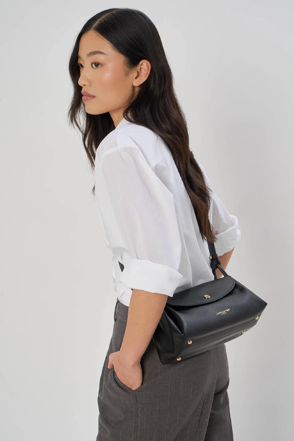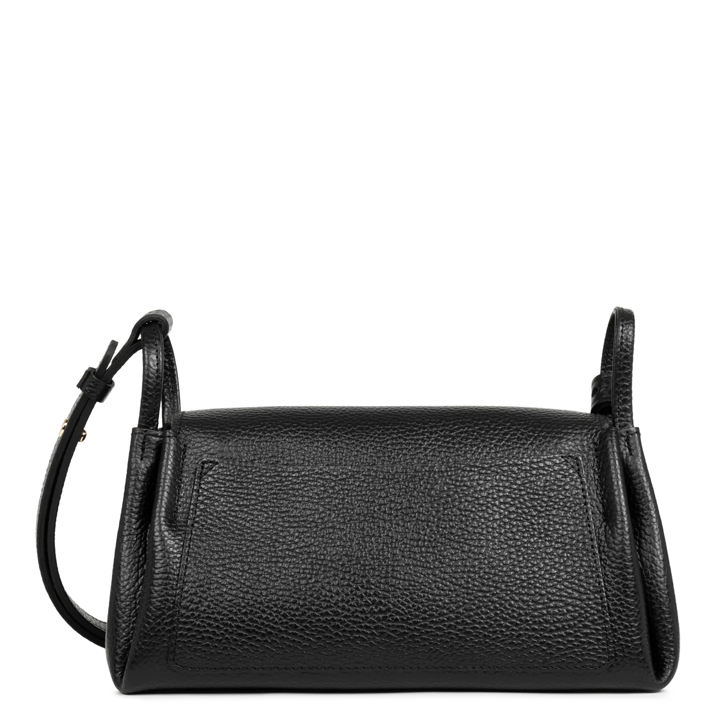 - This crossbody bag is crafted from grained cowhide leather. It features a simple front pocket, two simple interior pockets, and a simple rear exterior pocket. It can be worn over the shoulder or crossbody.